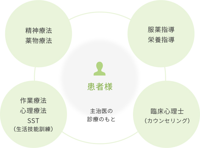 当院では3つの精神科専門病棟を設けており、患者さまの状態に応じて、最適な療養環境を提供させていただいています。病棟によって治療の段階や支援の内容が異なるものの、患者さまを中心として最適な治療を考えています。